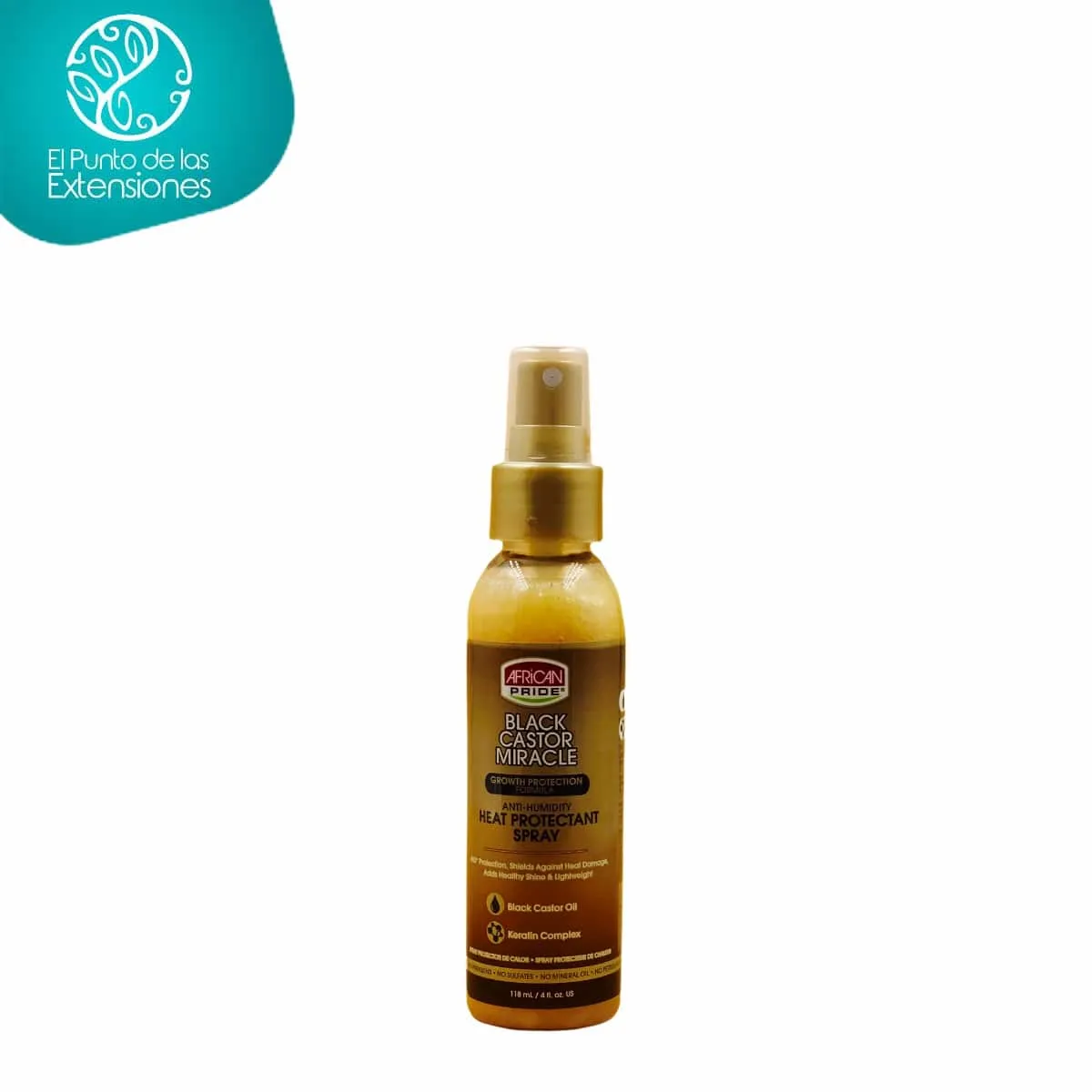 El protector de calor de la línea Black Castor Miracle de African Pride crea un escudo en los cabellos para protegerlos del daño generado por herramientas con calor como planchas, rizadoras o secadoras. Posee tecnología hidrófobo o anti-humedad, es decir, posee ausencia de atracción a la humedad lo que prolonga la duración del estilo. Su fórmula sin parabenos, aceite mineral, sulfatos y petrolato ayudan a la recuperación de cabellos débiles. Elaborado con ingredientes naturales como: aceite de ricino negro para fomentar el crecimiento y nutrir la piel cabelluda y complejo de keratina para suavizar el folículo y reducir el frizz.