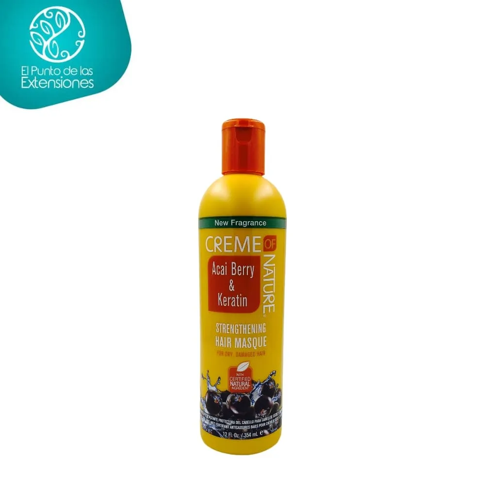La mascarilla fortalecedora de la línea bayas de acai y queratina de Creme of Nature ayuda a nutrir y reparar cabellos secos o con  daños aportándoles fuerza y vitalidad. Enriquecido con ingredientes naturales como bayas de acai para ayudar a prevenir el daño en la hebra y queratina vegetal para humectar e hidratar recuperando la estructura dañada de la hebra. Su coloración violeta no matifica el cabello. Su fórmula petrolatos ni aceites minerales protegen el cabello de futuros daños. Hecho en USA.