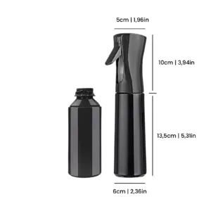 Botella de aspersión con boquilla de pulverización 360° y tubo interior en silicona en presentación de atomizador de rocío continuo, produce una bruma o niebla fina sostenida de 3 segundos logrando un efecto de pulverización continua de un líquido mediante un gatillo o manija suave, rápido y continuo que evita fatiga en manos. Para su funcionamiento utiliza tecnología precompresión sin usar recipiente presurizados o gases propelentes. Posee boquilla de pulverización 360 sin fugas. Diseño ergonómico de fácil uso, elegante y moderno. Ideal para humedecer rápidamente el cabello en dosis controladas. Capacidad de almacenamiento 10oz