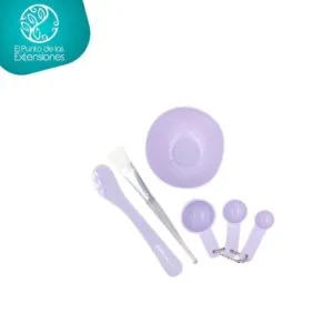 Kit de implementos dosificadores para mezcla y aplicación de tratamientos, mascarillas o hidrataciones capilares o faciales. Incluye tres medidores o chucharas dosificadoras de: 2.5ml, 1.5 ml y ml. Una paleta de, una brocha de y una taza de oz.