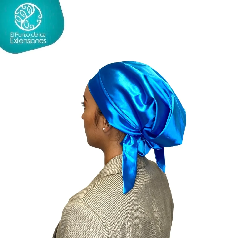Desliza tu cabello dentro de la funda de manera que el tejido suave en satén sea el que queda en contacto con el cabello y ajusta con un nudo en la parte inferior o superior de la cabeza según desees.