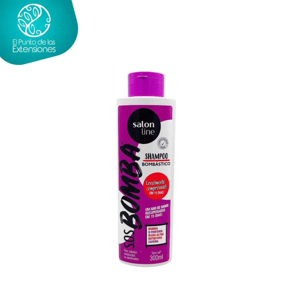 El champú bombástico de la línea S.O.S Bomba de SalonLine limpia la piel cabelluda sin resecarla mientras promueve el sano crecimiento. Recupera la salud en la piel cabelluda nutriendo e hidratándolo. Elaborado con aloe vera para promover el crecimiento y eliminar células muertas y exceso de sebo en la piel cabelluda, d-pantenol para mantener la hidratación y combatir puntas abiertas, cafeína para estimular el crecimiento mediante la activación de la circulación en la piel cabelluda, aceite de macadamia, aceite de girasol, aceite de sésamo, aceite de maíz y aceite de oliva para aportar nutrición e hidratación a cabellos secos. Producto liberado: sin sulfatos, petrolatos, parafinas, parabenos ni aceites minerales. Producto vegano. Producto cruelty free, no testado en animales.